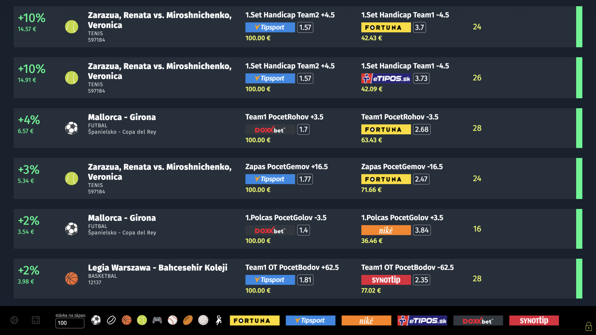 Arbitráže, tiež všeobecne známe ako „stávky na istotu“, predstavujú porovnávanie kurzov rôznych stávkových kancelárií a následne skúmanie, či tieto vybrané stávkové ponuky môžu generovať zisk alebo nie. Ak môžu, všetko, čo musíte urobiť, je podať stávku na všetky výsledky s najlepšími kurzami ponúkanými rôznymi stávkovými kanceláriami a čakať na koniec zápasu, aby ste dostali svoj zisk.